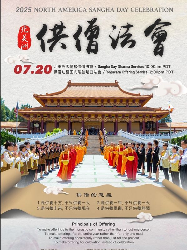 According to the Ullambanapatra Sutra, when Maudgalyayana, a chief disciple of Sakyamuni Buddha, was unable to alleviate the suffering if his mother in the realm of hungry ghosts, the World-Honored One told him that the only way to deliver his mother from the pains of suffering is to rely upon the strength of monastics of all directions in their cultivation of meritorious virtues. The Buddha instructed his disciples to dedicate an elaborate offering of food and fruits to all Sangha members in the names of his parents from the past seven lifetimes as well as the present lifetime because the practice of Sangha offering has the power to transform and deliver all sentient beings.